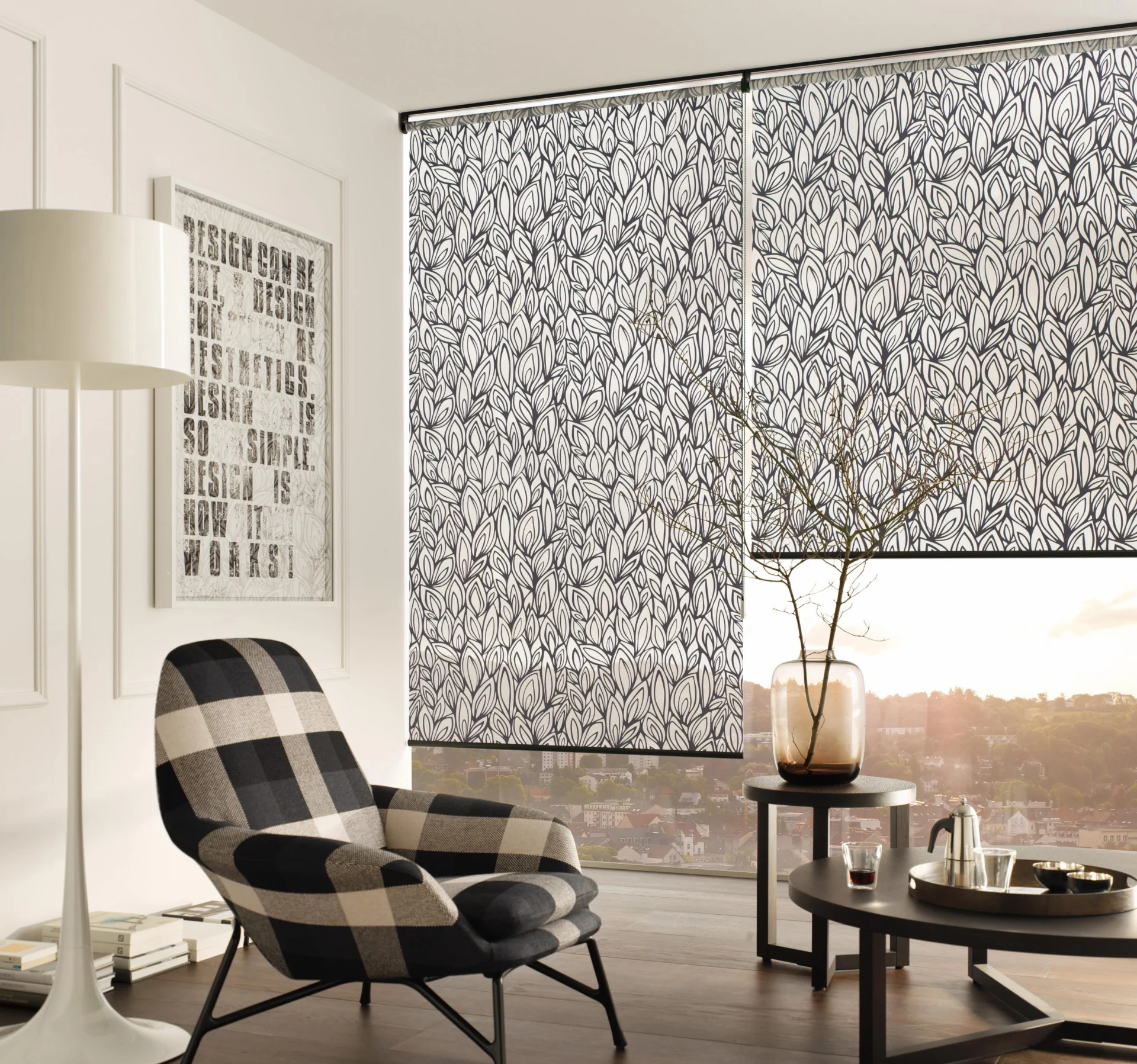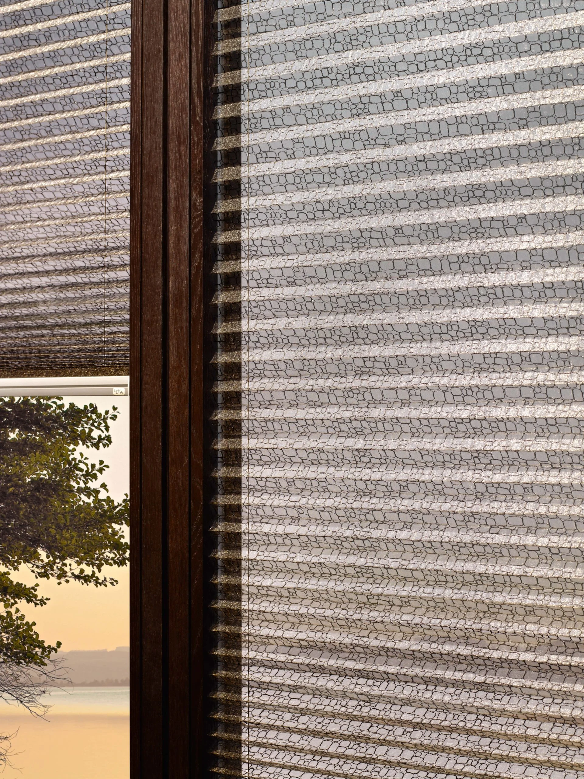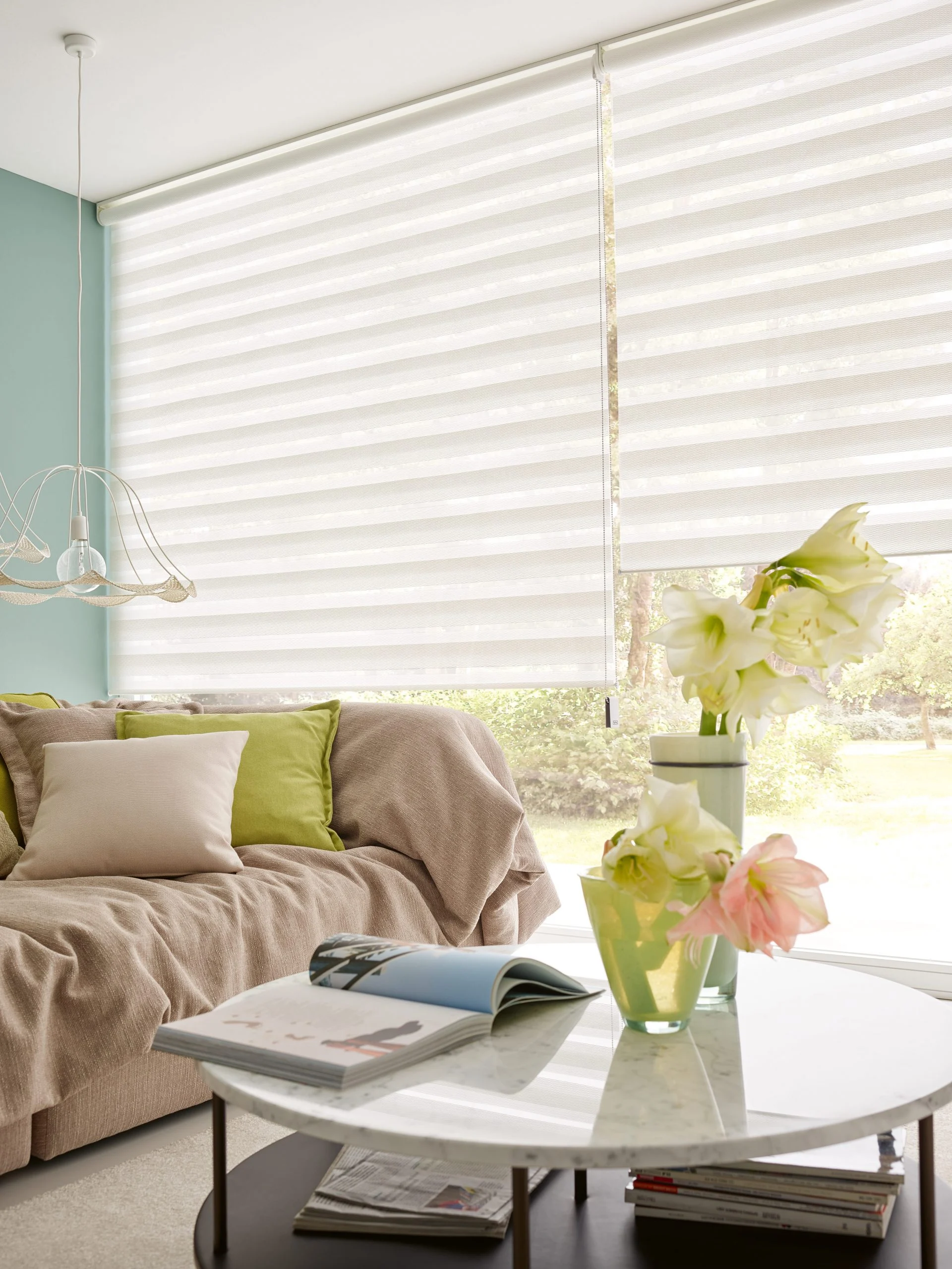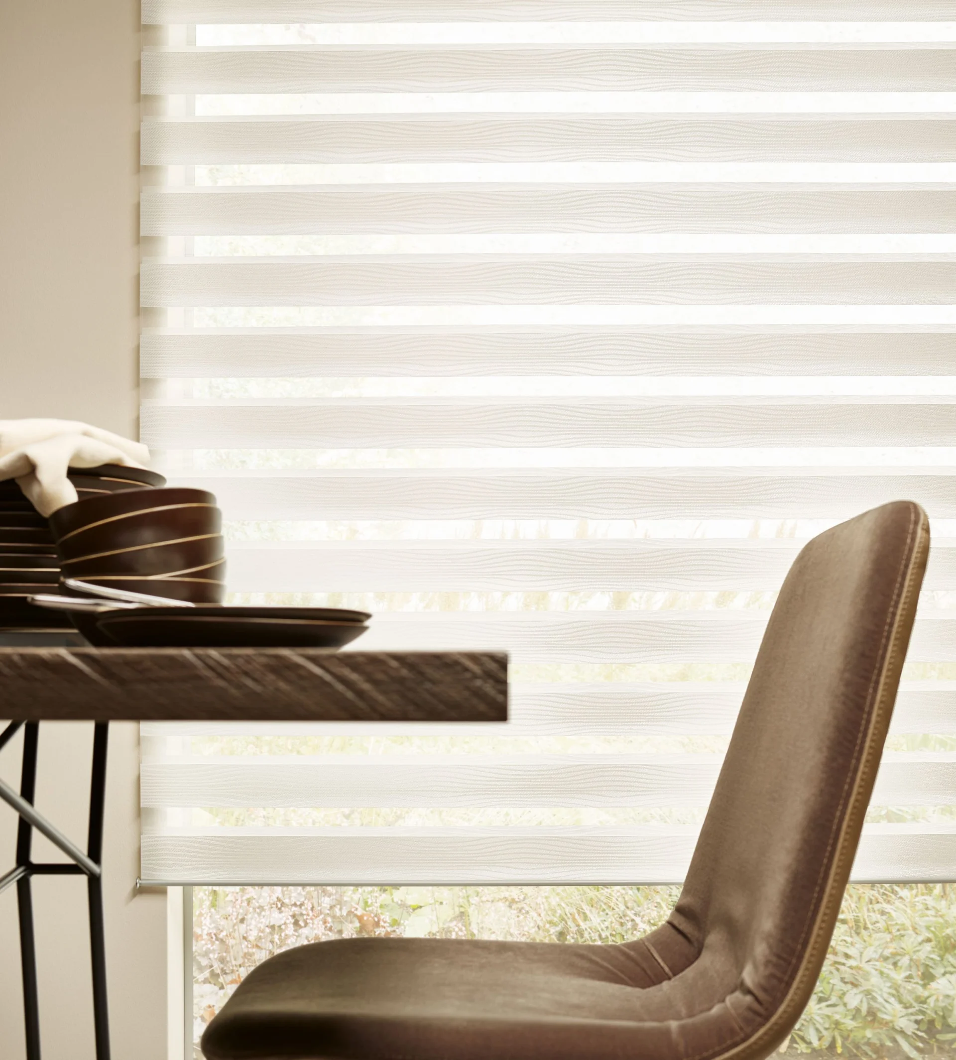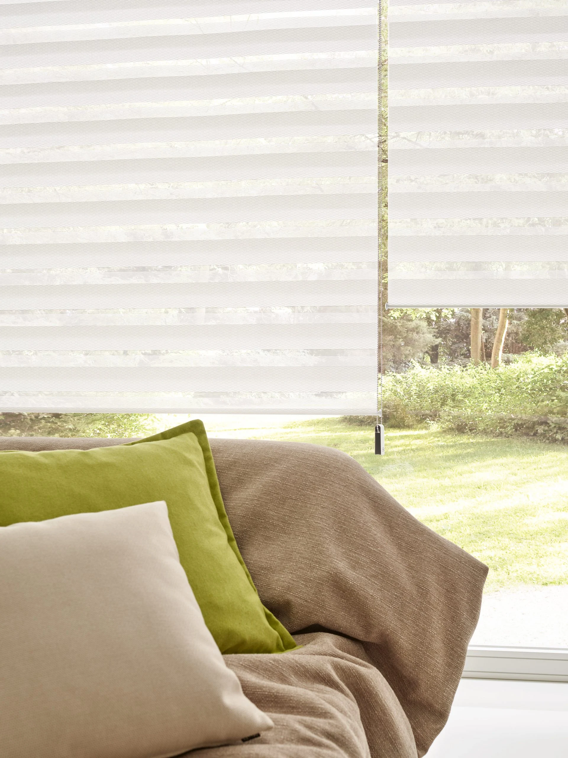 Naprzemiennie kryjące i transparentnie tkane tkaniny umożliwiają płynną regulację światła, aby oświetlenie pomieszczenia było przyjemniejsze.