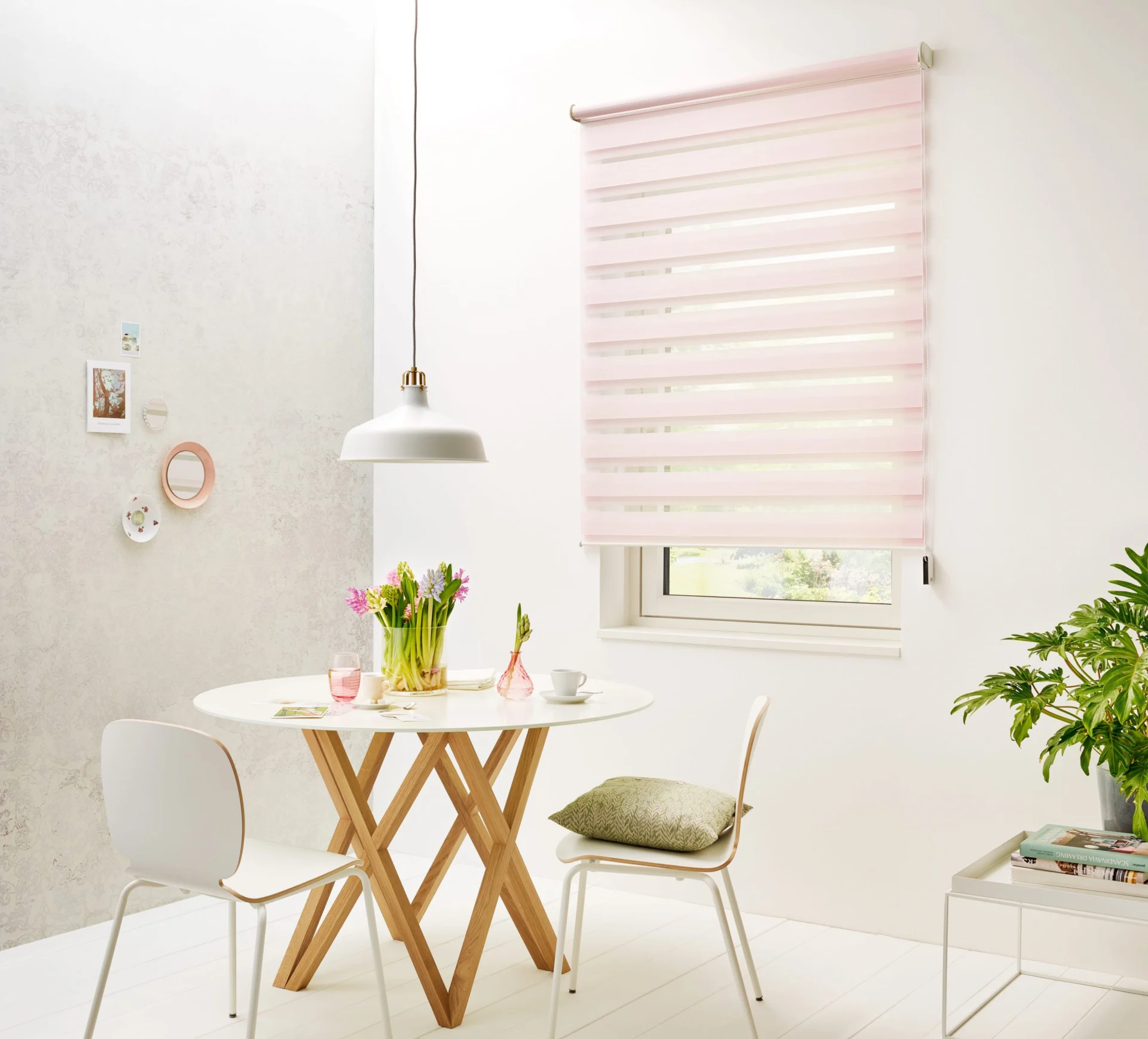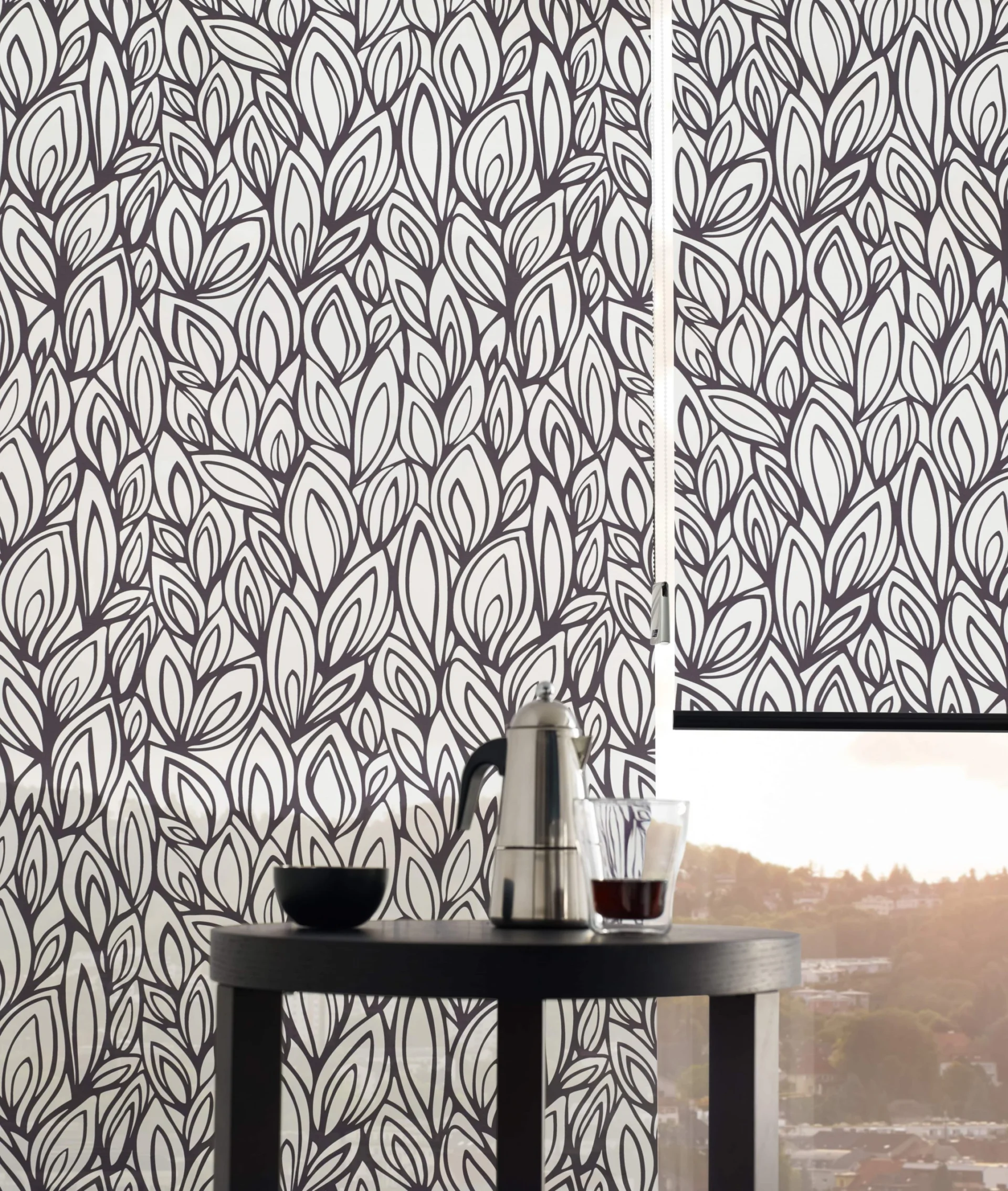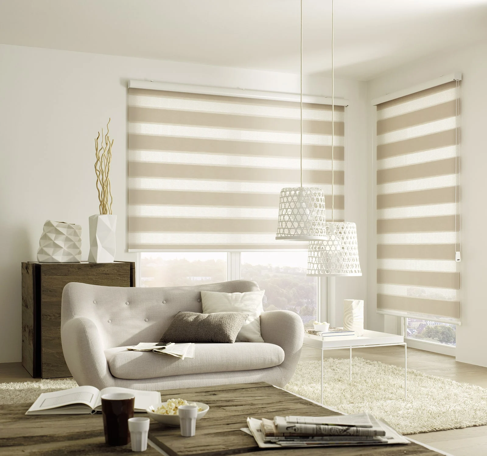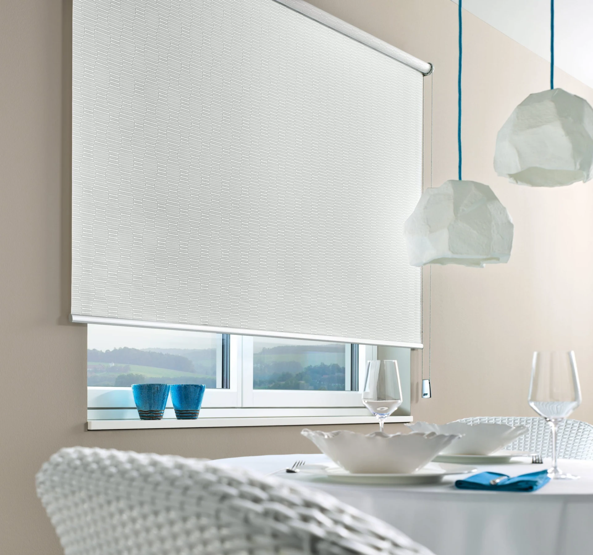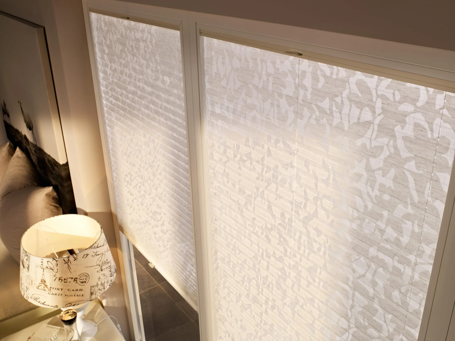 Naprzemiennie kryjące i transparentnie tkane tkaniny umożliwiają płynną regulację światła, aby oświetlenie pomieszczenia było przyjemniejsze.