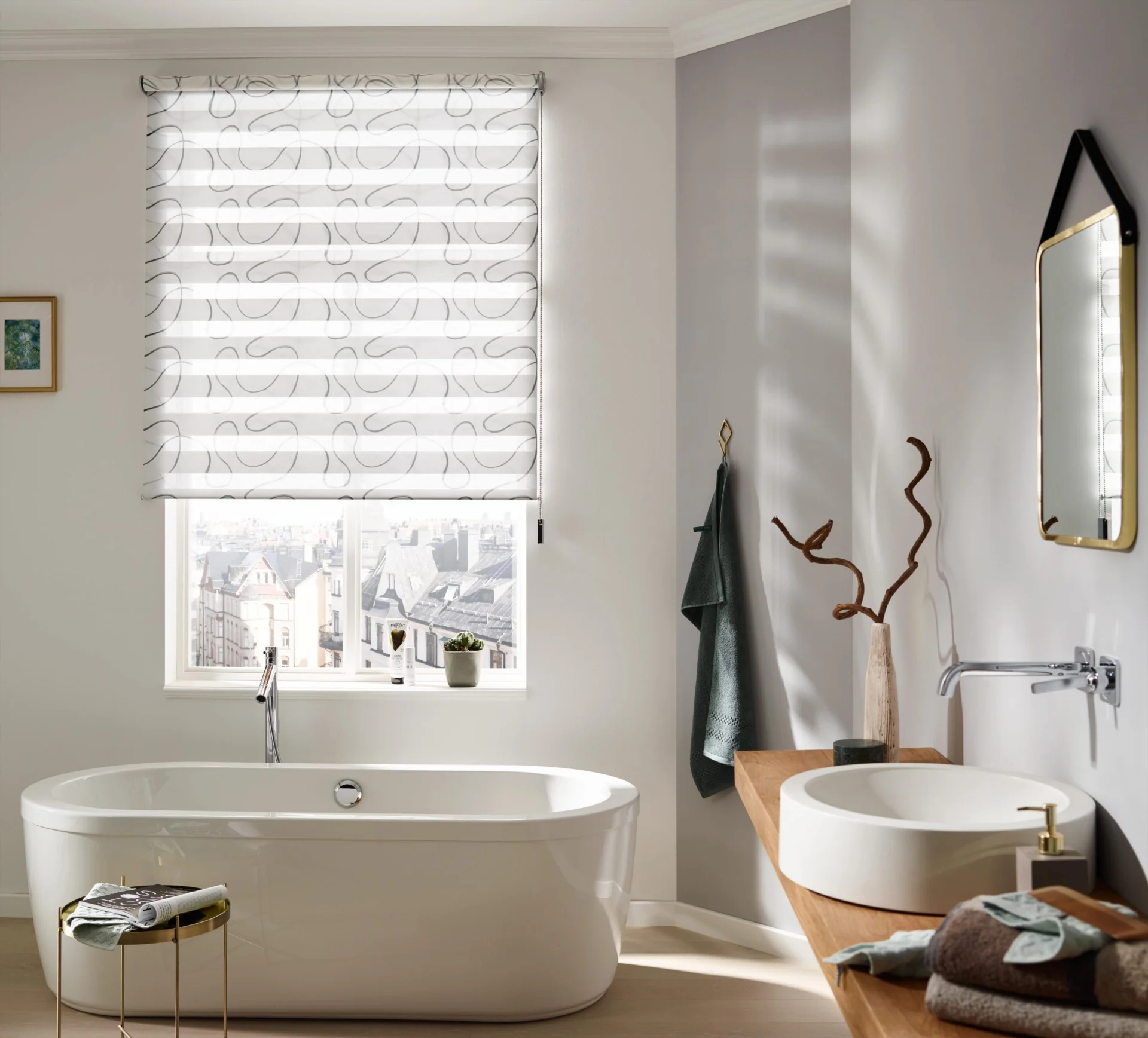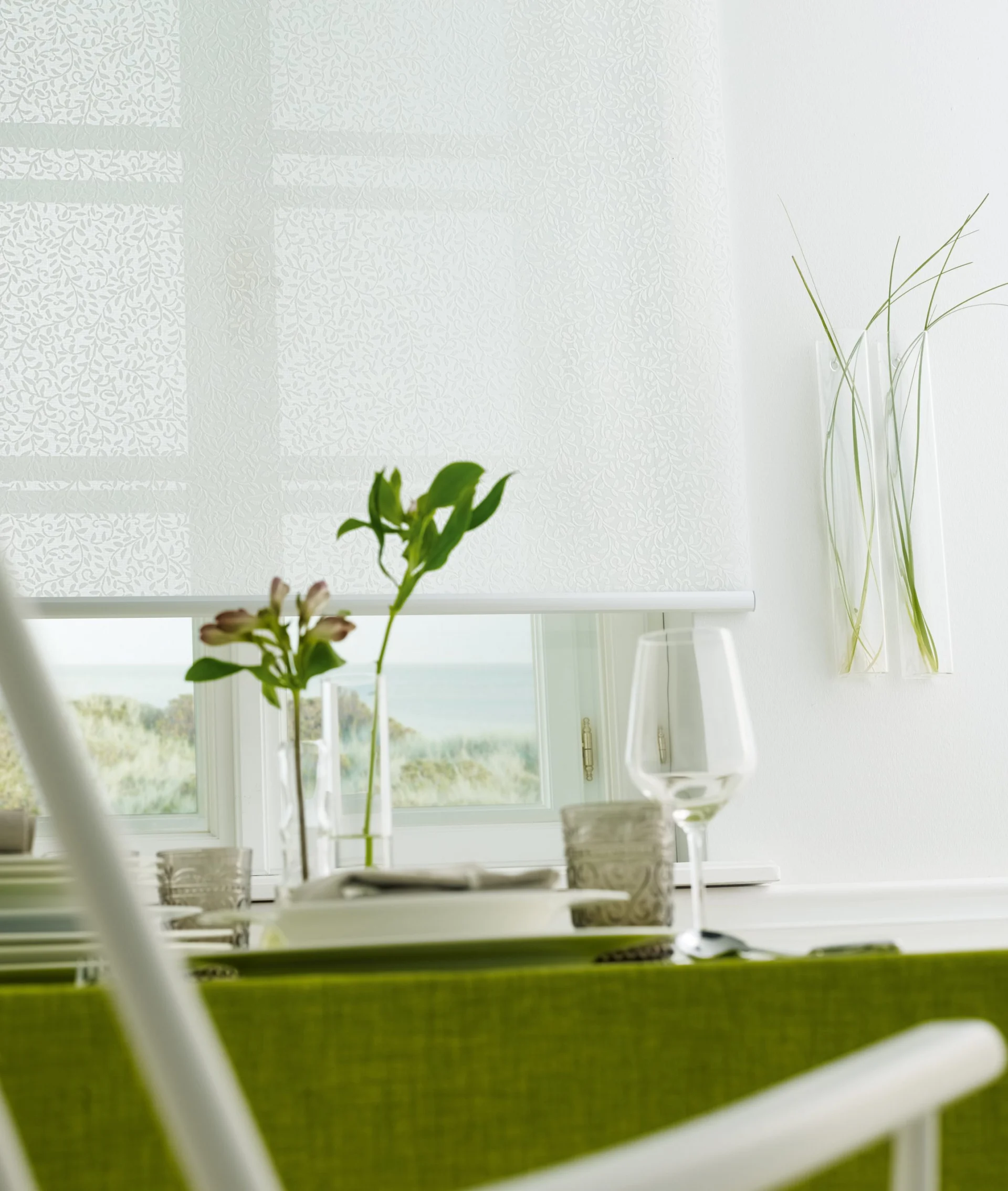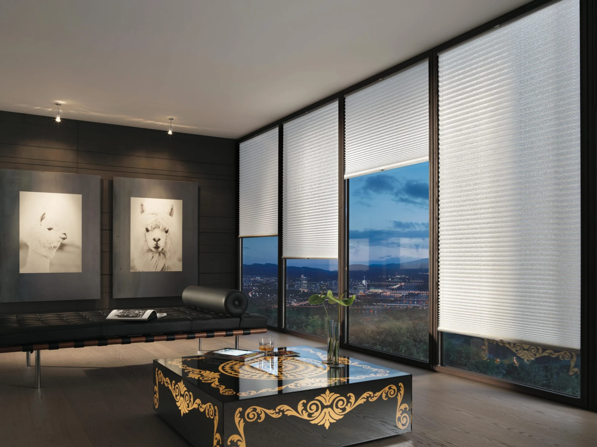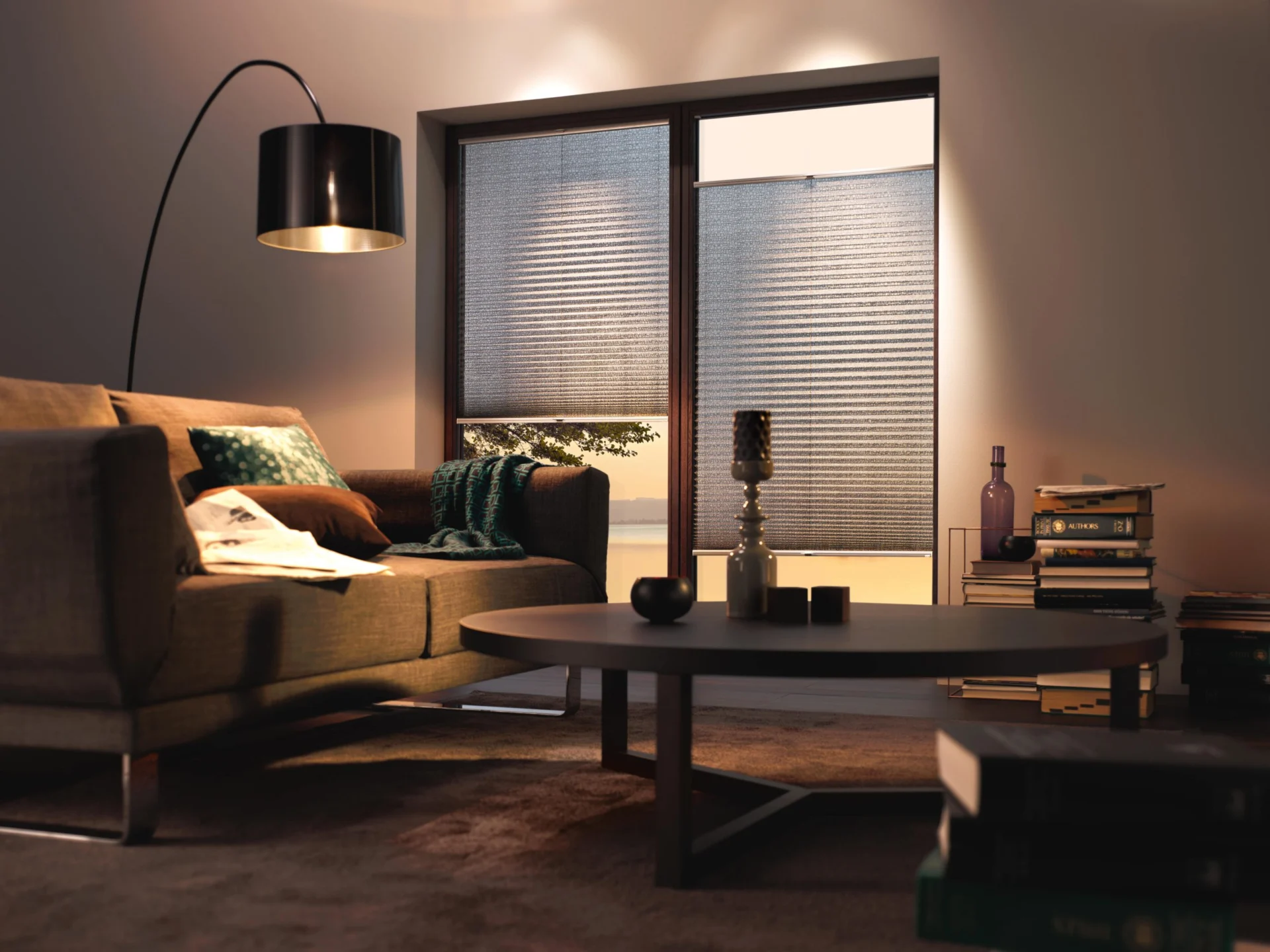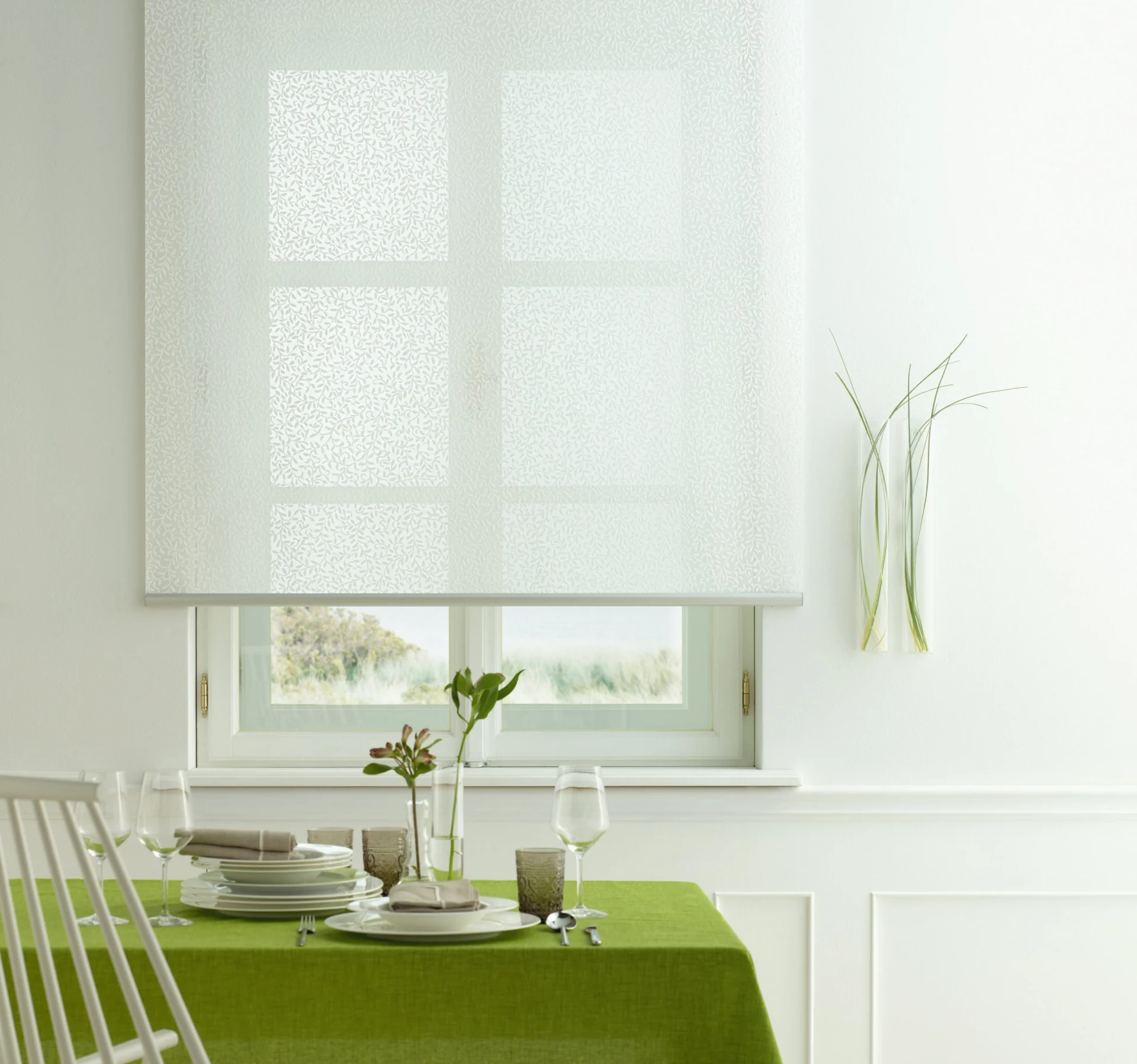Naprzemiennie kryjące i transparentnie tkane tkaniny umożliwiają płynną regulację światła, aby oświetlenie pomieszczenia było przyjemniejsze.